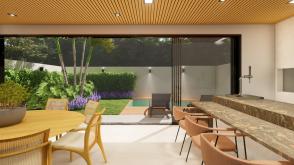 Área gourmet com churrasqueira, piscina com spa e vestiário.