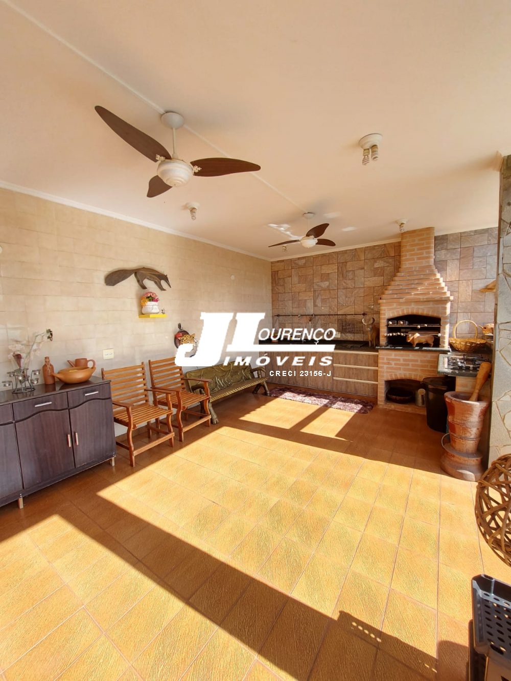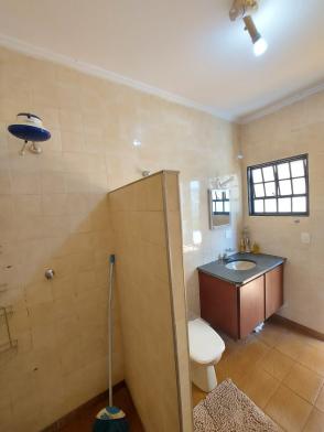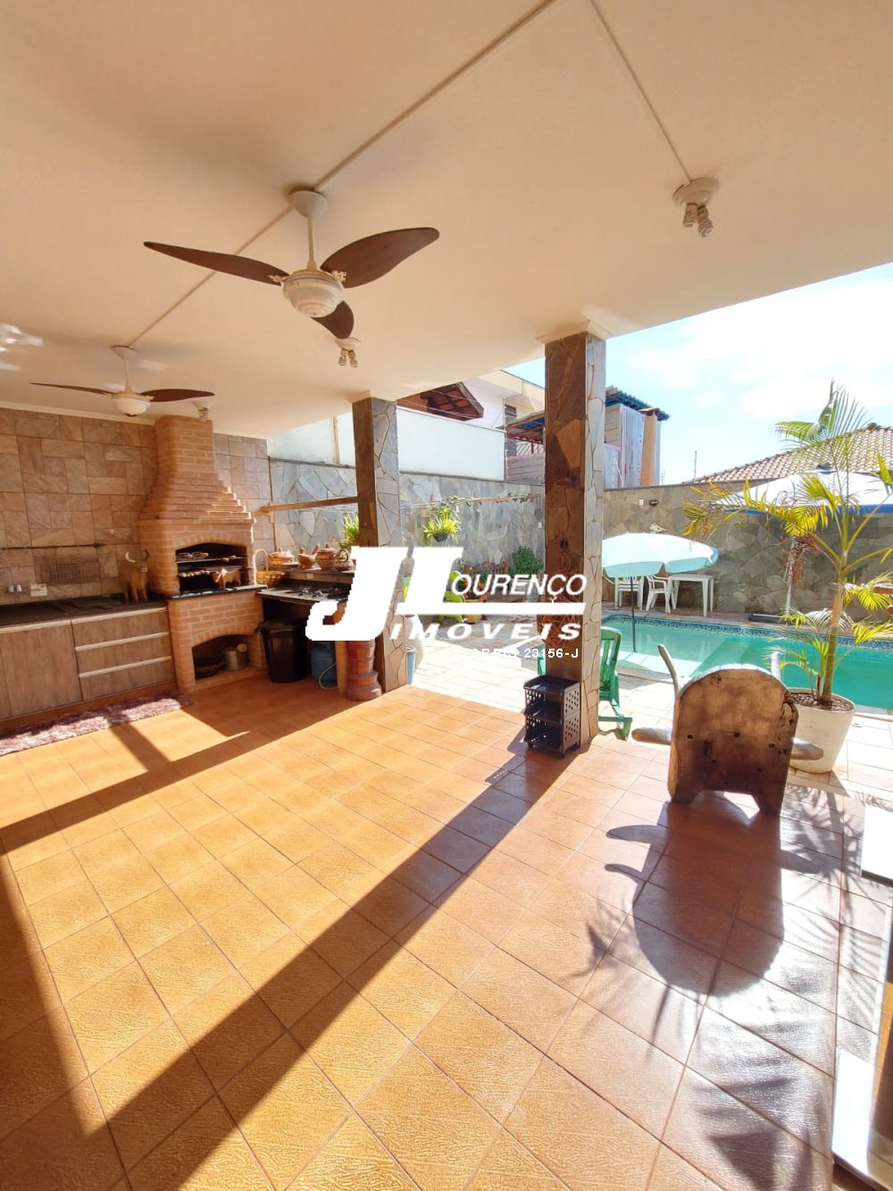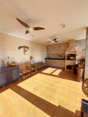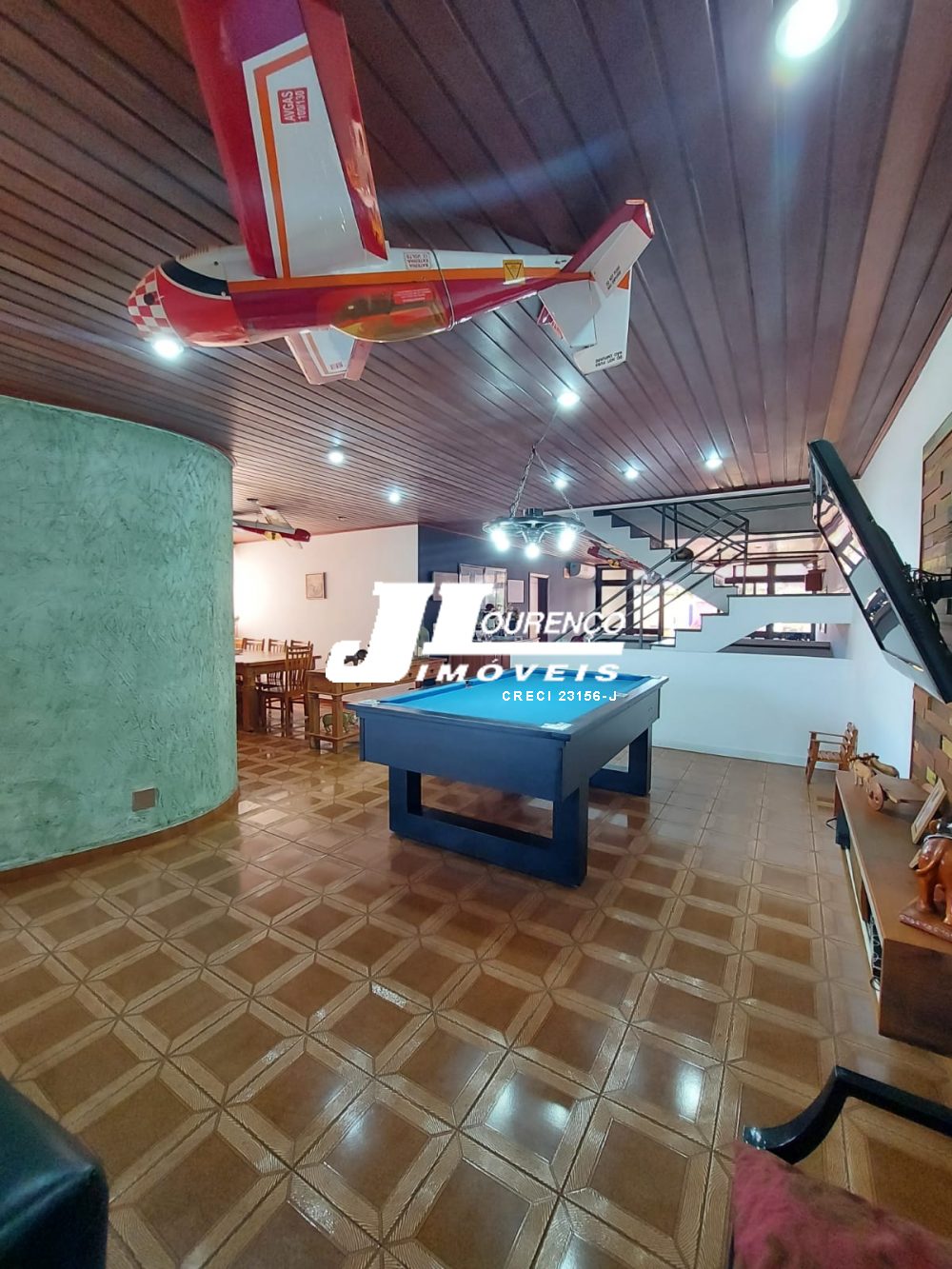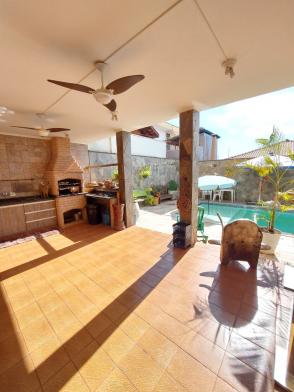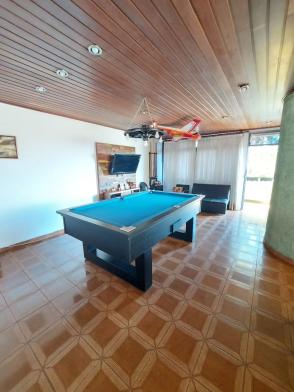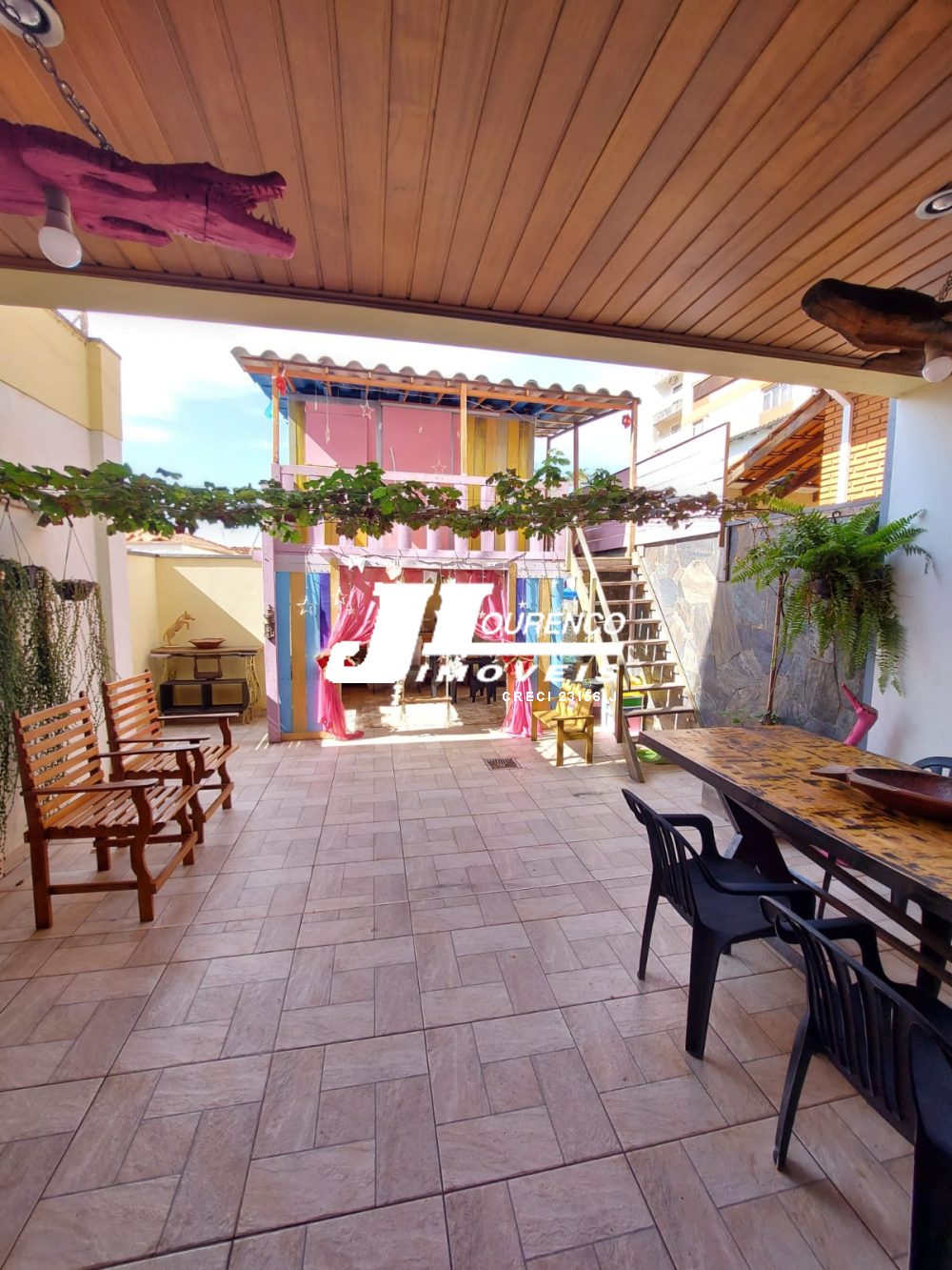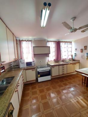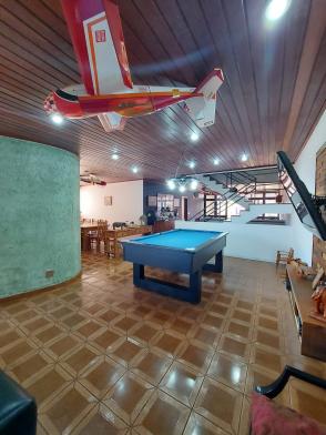 1º piso: escritório com ar, banheiro, copa e sala grande com 3 ambientes com ar condicionado e ventilador, área externa com lavabo, cozinha com duas pias e ventilador, despensa, lavanderia, quarto de empregada com banheiro, canil e uma casa infantil de 2 andares com pia na parte de baixo e sacada em cima, medindo 24 m2