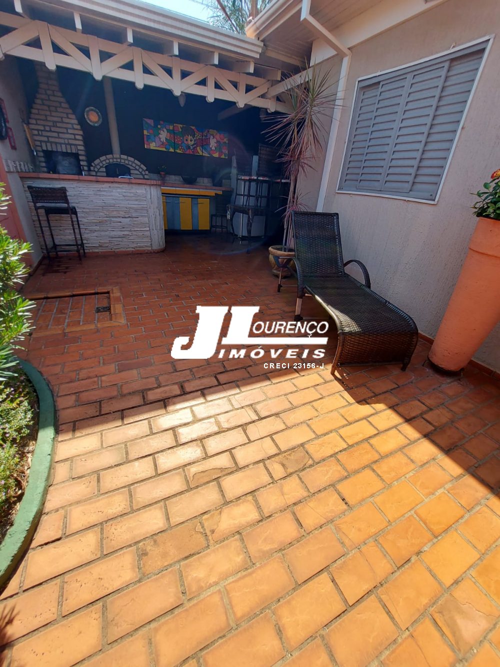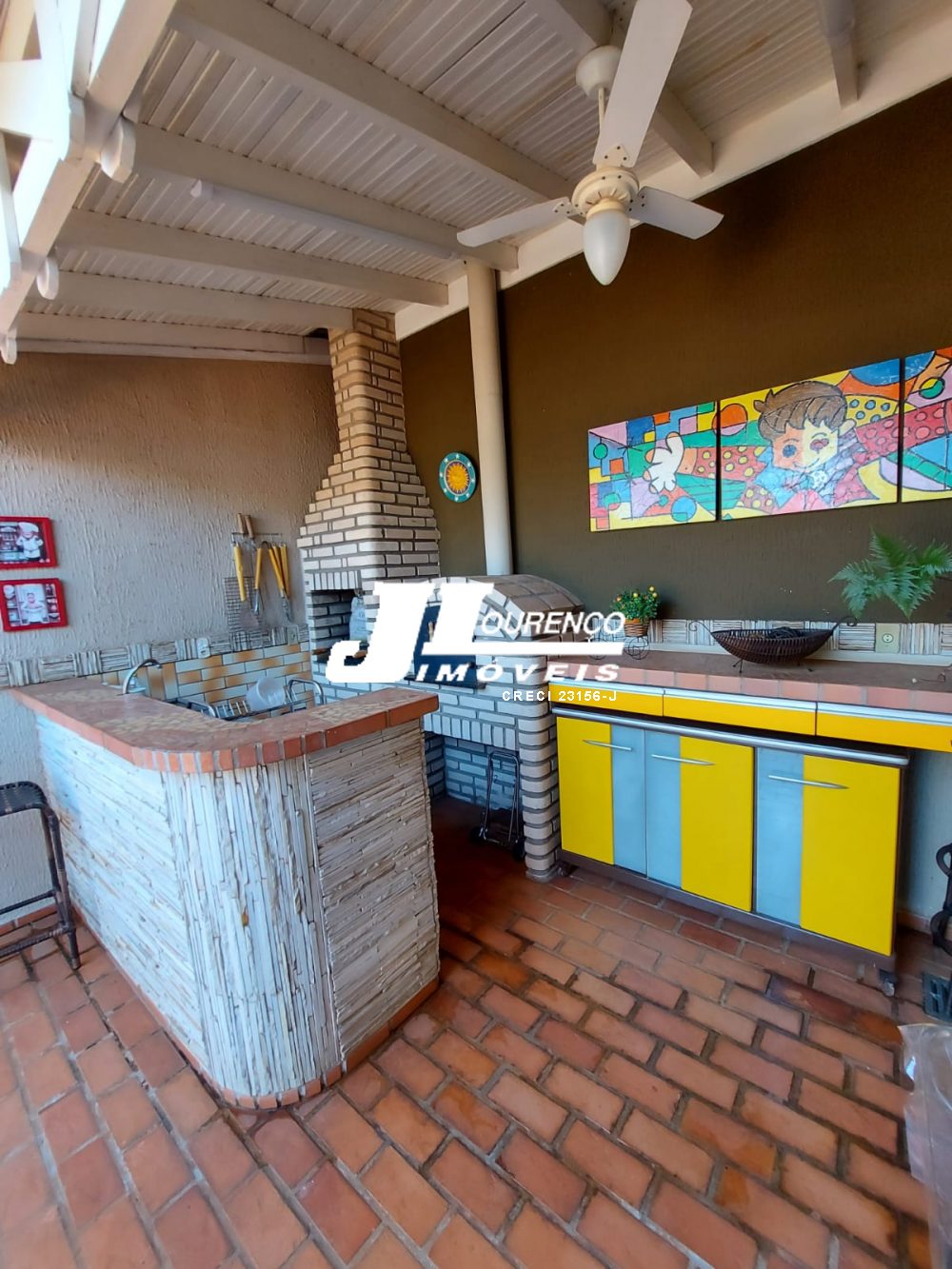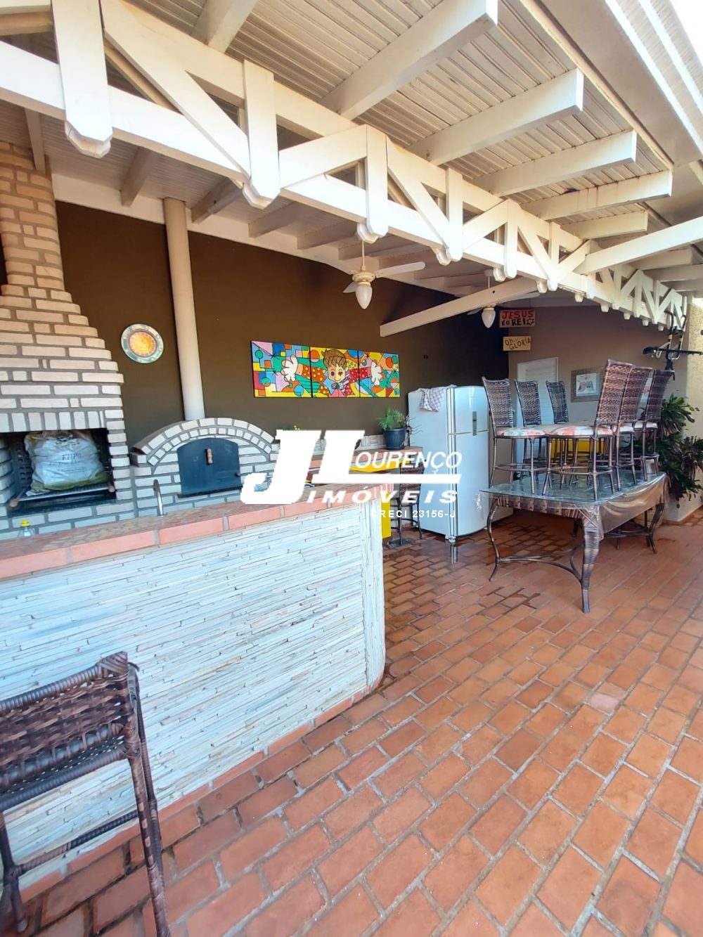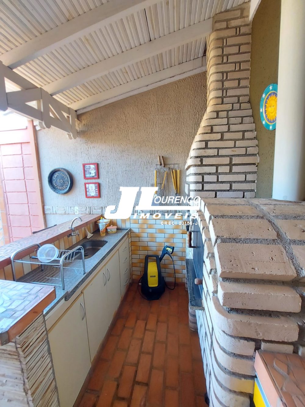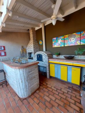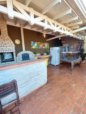 Varanda gourmet com churrasqueira, forno de pizza, banheiro.
